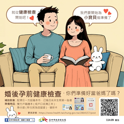 114年臺中市婚後孕前健康檢查補助宣導單張_11409 為提供安心生育環境,本市提供已婚市民「婚後孕前健康檢查補助」,資格條件為配偶任一方設籍本市且尚未生育第一胎者,須攜帶配偶雙方戶籍謄本或戶口名簿正本、身分證及健保卡至本市合約醫療院所即可接受檢查。補助期間為即日起至116年12月10日止,相關資訊請至臺中市政府衛生局網站/便民服務/好康服務/生育保健查詢。