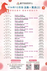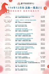 臺中市家庭教育中心邀您一起參與本月精彩多元的課程活動~從親職教育婚姻經營、數位教養、青少年溝通、幼兒教養到性別教育及婚前交往準備等主題應有盡有,讓我們在溫馨互動的氛圍中學習,累積創造幸福、和諧家庭的力量!