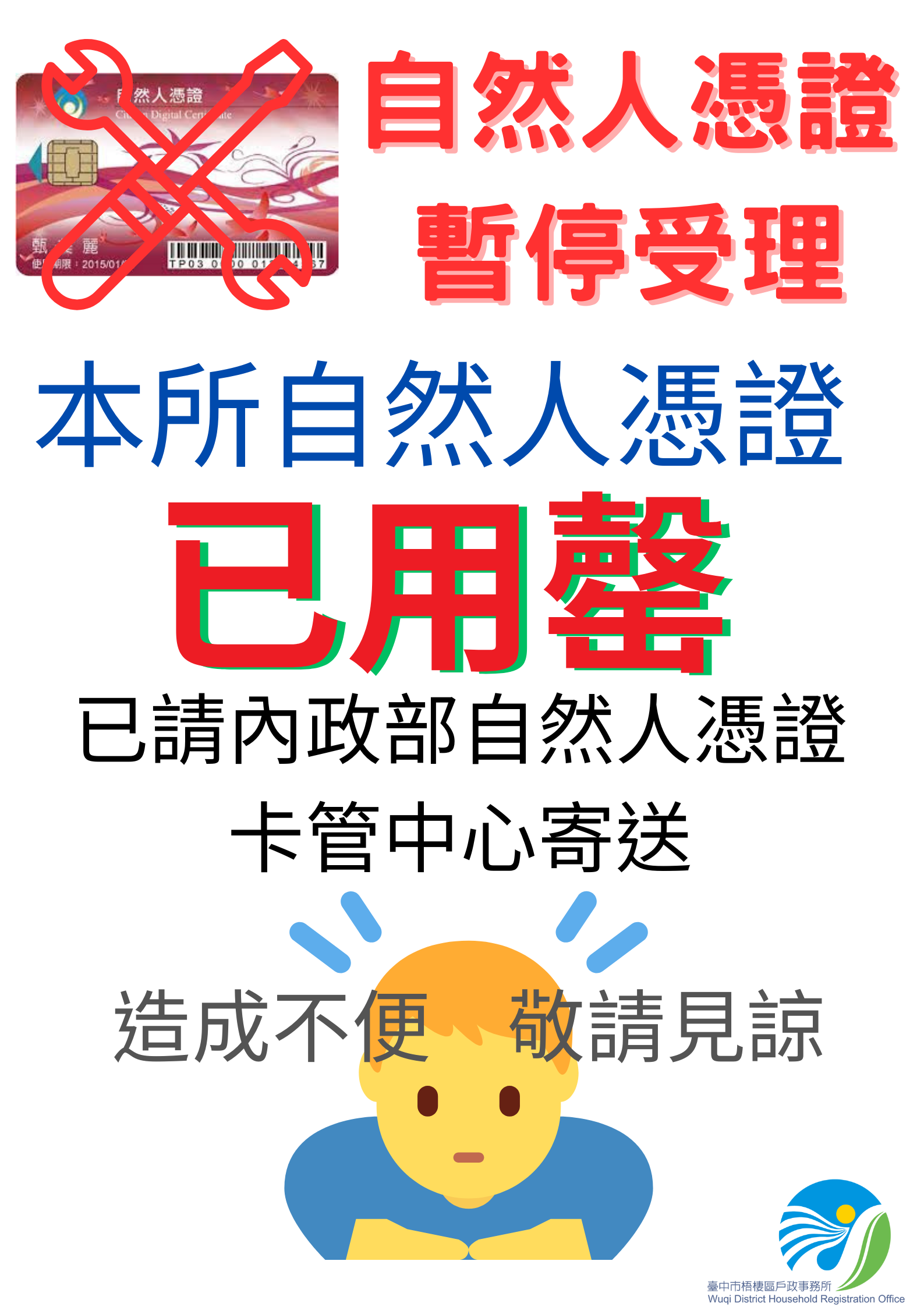 自然人憑證用罄 現有自然人憑證空卡25張(11412171116) 可受理申請 ------------------------------------------------------------------------- 本所自然人憑證卡片數量【已用罄】(11412150850) 近日申辦自然人憑證卡片案件遽增,已請內政部自然人憑證卡管中心寄送 造成不便,敬請見諒