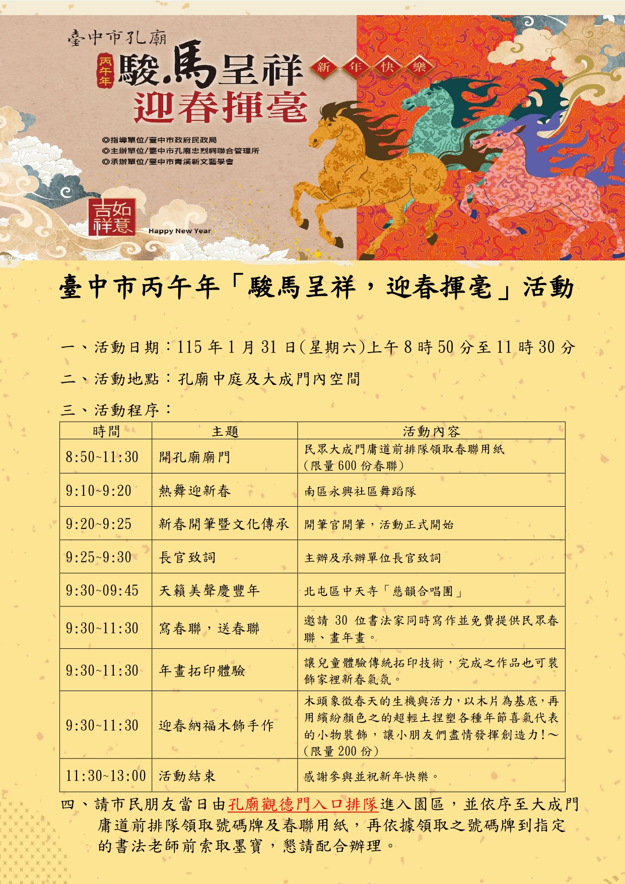 二、活動當日市民朋友可由孔廟觀德門入口排隊進入園區領取 春聯用紙,並於開場表演後由30位書法名家現場揮毫,為 民眾提供免費寫春聯畫年畫(限量600份),另規劃兒童年畫 拓印體驗區及迎春納福木飾手作(限量200個)區,讓小朋友 親自動手拓印年畫及製作年節吊飾,體驗動手玩創意的樂 趣,所得春聯及完成之作品皆可於農曆年節前夕布置家中 新春氛圍。