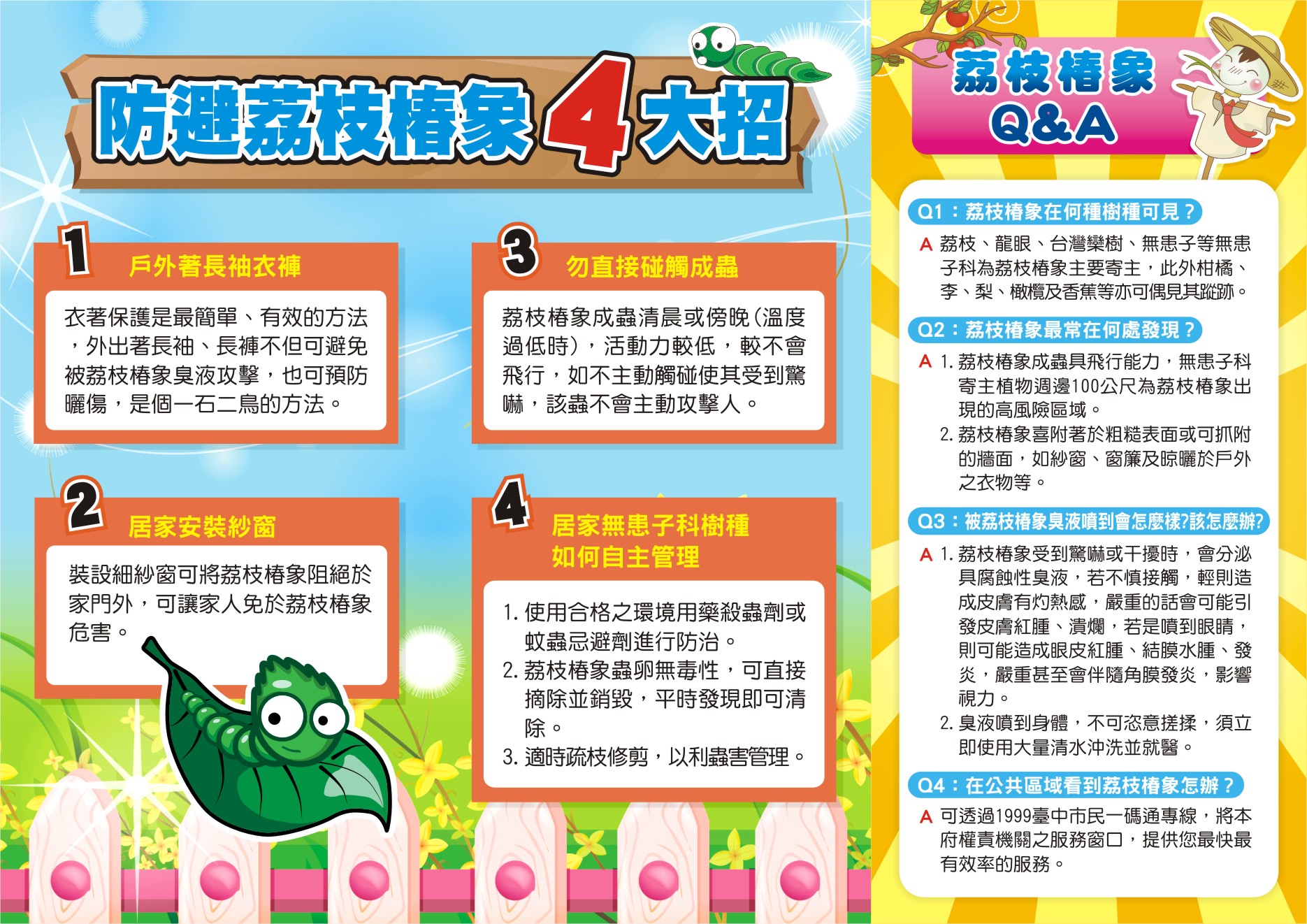 農業本部動植物防疫檢疫署經現地會勘及專家學者建議,依據 目前氣候狀況、荔枝及龍眼作物品種與生長期差異及荔枝 椿象雌蟲發育狀況,將全國荔枝及龍眼產區分為高屏、嘉 南、中彰投雲及苗栗等4區,分別訂定最適宜的防治期,整合農民進行區域化學共同防治。