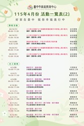 臺中市家庭教育中心115年4月份活動一覽表1 臺中市家庭教育中心【115年4月份活動一覽表】 🍀幸福相伴🍀 🌿童心飛揚・親子幸福好時光! 以陪伴大家增進自我成長,促進家庭和諧,提升親子、伴侶親密關係為目標,精心規劃貼近生活議題的多元課程活動,誠摯邀請您一起參與❣