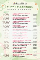 臺中市家庭教育中心115年4月份活動一覽表 臺中市梧棲區戶政事務所 2026-03-31 臺中市家庭教育中心【115年4月份活動一覽表】 🍀幸福相伴🍀 🌿童心飛揚・親子幸福好時光! 以陪伴大家增進自我成長,促進家庭和諧,提升親子、伴侶親密關係為目標,精心規劃貼近生活議題的多元課程活動,誠摯邀請您一起參與❣